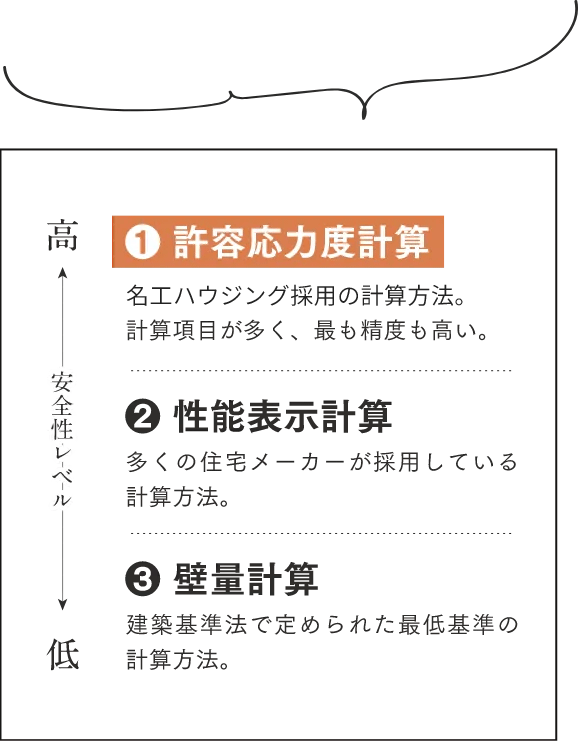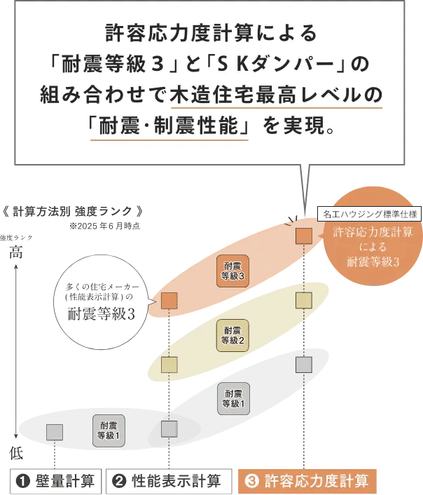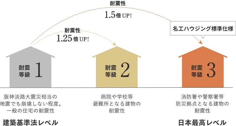 Product 工法紹介 在来軸組工法 × 金物工法 ハイブリッド工法 強度は在来工法の約 1.5倍以上 通柱の接合部分に金物を使って接合するため、金物を使わない在来工法の約1.5倍以上の強度が期待できます。 ボルト&ドリフトピン ボルトとドリフトピンで木材同士を引き寄せて構造材の剛性を高め、より強く安全に仕上げています。 1. 長期優良住宅 2. 耐震等級3 3. 断熱等級5.6 4. ⾼性能窓 5. 24 時間換気 6. ハイ ベストウッド 7. 吹付断熱 8. 透湿防⽔遮熱シート 9. ⾼耐候シーリング 10. 屋根 11. スマートソーラー 12. 外壁(サイディング) 13. 選べる建具シリーズ 14. 選べる水廻りシリーズ POINT 01 長期優良住宅「長期優良住宅認定申請書」込み 次世代まで住み続けられる性能 一般的な日本の住宅寿命は平均30年程度と言われています。長期優良住宅は耐久性、耐震性、メンテナンス性、省エネルギー性、それぞれ一定以上の基準を満たすことで、海外先進国と同じ約60年〜100年の長い住宅寿命を実現。建替えによる費用負担も軽減することができます。 [長期優良住宅認定条件] 住戸面積 : 一戸建:75㎡以上、共同住宅等:55㎡以上、一戸建及び共同住宅等ともに1階床面積40㎡以上(階段面積を除く) ※上記未満の場合は認定申請ができないため、税制優遇措置の対象外となります。 耐久性 認定種別 長持ちする家であること 認定条件 耐久性の最高等級3、 定期的な点検を可能とする措置 名工ハウジングの長期優良住宅 シロアリの侵入を防ぐ 防蟻処理 (GLより1mまで) 耐震性 認定種別 地震に強い家であること 認定条件 耐震等級2 以上 (許容応力度計算の場合) 名工ハウジングの長期優良住宅 許容応力度計算による 耐震等級3(耐力面材) メンテナンス性 認定種別 メンテナンスしやすい家であること 認定条件 メンテナンス性の等級 最高等級3 名工ハウジングの長期優良住宅 給排水 サヤ菅工法 省エネルギー性 認定種別 省エネな家であること 認定条件 断熱等級5 かつ 一次エネルギー消費量等級6 名工ハウジングの長期優良住宅 断熱等級6 一次エネルギー消費量等級6 太陽光パネル 第一種換気システム 各種減税や割引制度が利用可能 ※2025年6月時点の情報です。※詳しくはスタッフへお問い合わせください。 「住宅ローンの金利」引き下げ ■フラット35の借入金利(当初5年間) ※1 借入申込時に夫婦であり、借入申込年度の4月1日において夫婦のいずれかが40歳未満の世帯※2 借入申込年度の4月1日において18歳未満である子 ■フラット50 返済期間の上限が50年間 住宅売却の際、借入金利のままで購入者へ 住宅ローンの返済を引き継ぐことが可能です。 「耐震等級割引」 所定の確認資料を提出することで、住宅の耐震性に応じた 地震保険料の割引を受けることができます。 耐震等級2 → -30% 耐震等級2 → -30% 「税」の特別措置 所得税(住宅ローン)減税 借入限度額 ■ 2025年(令和7年)入居の場合 すべての世帯4,500 万円 控除率0.7%、控除期間 最大13年間 最大455万円控除 標準的な性能強化費用相当額(上限650万円)の 10% を その年の所得税から控除。※住宅ローン減税と投資型減税は併用不可。 ■ 2026年(令和8年)3月31日までに新築された住宅 不動産取得税 課税標準からの控除額増額 控除額1,200万円 → 1,300万円 固定資産税 減税措置(1/2 減額)適用期間延長 戸建 / 1~3年間 → 長期優良住宅1~5年間へ延長 POINT 02 耐震等級3「住宅性能評価書」or「長期優良住宅認定申請書」込み 大地震に備える最高等級の家 「耐震等級」とは、地震に対する建物の強さを表す指標です。秀光ビルドは、最高等級である「耐震等級3」を標準仕様としています。 「耐震」とは、簡単に言えば「我慢する構造」のことです。建物をがっちりと固め、地震による建物の倒壊を防ぎます。※間取りにより実装できない場合がございます。 「許容応力度計算」による精度の高い耐震等級 3 「耐震等級3 だから安心」とは、 言い切れないかも…? 耐震等級の計算には精度の違う3種類の方法があり、同じ耐震等級でも、計算方法により住宅強度が変わってくる場合があります。 地震保険料の割引が受けられる 耐震等級3を取得すると、地震保険料の割引(耐震等級割引)を受けることができます。 詳しくは長期優良住宅Point.02「耐震等級割引」をご確認ください。 POINT 03 断熱等級5.6 ZEH水準をはるかに上回る断熱性能 7段階からなる住宅の断熱性能を表す指標で、数値が大きいほど断熱性能が高いことを示します。名工ハウジングの家は全棟ZEH水準。特に断熱等級6は、ZEH水準をはるかに上回る断熱性能を有するため、まほうびんのような保温力と冷暖房の節電効果も期待できる家計にやさしい省エネハウスを叶えます。 UA値 0.46 断熱性能を表す「外皮平均熱貫流率」 UA値とは、住宅の壁や屋根・窓等の開口部から室内の熱がどのくらい外へ逃げやすいかを表したもので、数値が低いほど断熱性能が高いことを示します。ZEHの基準値は0.6以下。断熱等級6の場合は0.46とかなり高い水準となり、年中快適な暮らしを叶えます。 ※住