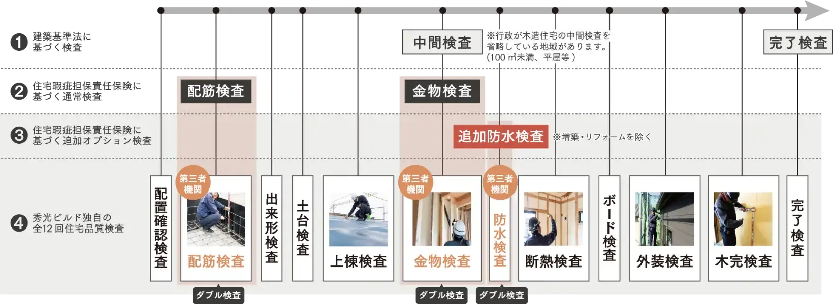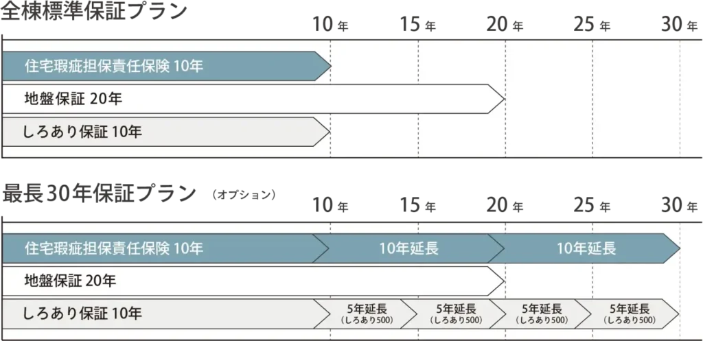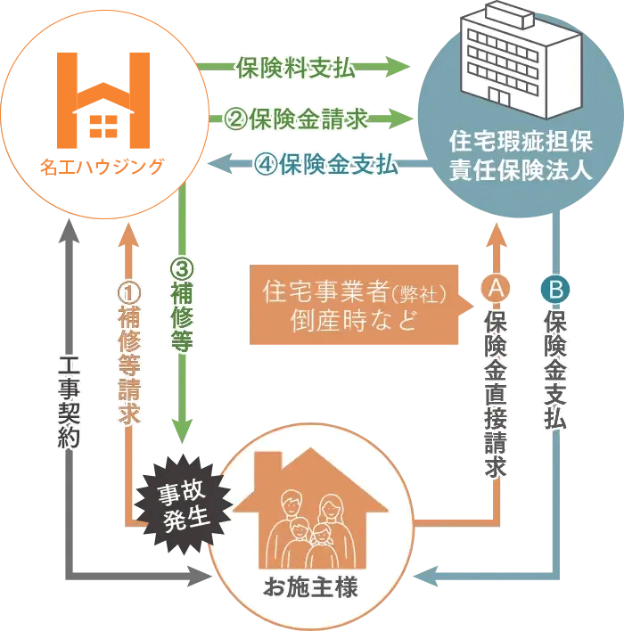 Service サービス紹介 資金計画、設計、各種申請、建築工事、そして暮らしに必要な設備まで、すべてを「コミコミ仕様」でご提供しています。 また、高い品質を守るための厳格な検査体制を整え、施工後も安心して暮らしていただけるよう、アフターサポートや保証制度も充実。 万が一に備えた保証内容は、施工主様の立場に立って設計されており、長く安心して暮らせる家づくりを実現します。 安心 保証 品質 工事・申請から暮らしの設備までコミコミ仕様 工事・申請に必要なものから快適な暮らしに必要な設備までコミコミ。すぐに生活が始められる安心仕様。 ※工事中の電気代は秀光ビルド負担・水道代はお客様負担となります。 確認申請・図面作成 建築確認申請(建築基準法や条例に適合しているか確認を受けること)に必要な書類の準備や手続き、図面の作成もお任せください。 仮設工事 仮設足場・仮設電気・仮設トイレなど、工事に必要な準備にも追加費用はいただきません。 屋内外給排水(7mまで) 建物内給排水に加え、敷地より7m以内の給水、排水工事、外部立水栓も1ヶ所まで(※7mまで)はコミコミです。 ※建築地により個別に必要な申請や工事・運搬等は別途 カーテン・レール・選べる照明器具 エアコン・TVアンテナ(BS付) 暮らし始めてから必ず必要になるものもコミコミです。 お引き渡し後の保証 全棟標準10年保証 最長30年まで延長可能 住宅瑕疵担保責任保険 /標準10年保証 ※有償で10年ごとに最長30年まで延長可能 地盤保証 /標準20年保証 しろあり保証 /標準10年保証 ※有償で5年ごとに最長30年まで延長可能 住宅完成保証 ※ご契約時に加入 〈 保証サービスご提供イメージ 〉 ※延長をご希望の場合は点検(無償)を行い、不具合が見つかった場合はメンテナンス(補修費用別途)が必要となります。※しろあり保証は、完了検査合格日より10年となります。 住宅完成保証制度 全棟標準10年保証 最長30年まで延長可能 着工後、最後まで住宅の完成を保証する制度です。万が一弊社にて建築工事が継続できなくなった場合でも、お施主様が最小限の追加負担(主契約の請負金額の20%までを保証)で住宅を完成できるように保証する「家づくりの保険」とも呼ばれる制度です。 ※契約時にご加入、着工時に「住宅完成保証書」を発行いたします。 地盤保証制度 全棟標準10年保証 最長30年まで延長可能 地盤調査・地盤改良工事が原因の不同沈下(地盤のゆがみなどによって建物が傾くなどの不具合)が生じた場合に補修、または損害賠償で保証を行う制度です。 [ 保証期間 ] 基礎工事の着工日〜引渡日から起算して20年を経過する日まで [ 保証者 ] 住宅技術協議会および住宅技術協議会に登録された地盤会社 ワンストップサービス 住宅瑕疵担保責任保険と合わせて保証をより厚く、地盤保証と住宅瑕疵担保責任保険をまとめて保証します。 確かな技術力 地盤調査および地盤改良工事を行う地盤会社は技術や過去の実績で審査を行ったうえで、住宅技術協議会に登録されています。 第三者審査 住宅技術協議会は、適正な判断を行う専門的知識を持った第三者として、地盤会社の調査データを解析、審査を行います。 万が一の安心 住宅技術協議会と地盤会社が連帯で保証主体となりますので、万が一地盤会社が倒産しても保証は有効です。 住まいの長期サポート10年 住宅設備 延長保証 住宅設備の延長保証サービスです。 メーカー保証と合わせて10年間、 設備を保証いたします。 [ 対象設備 ] ■レンジフード ■浴室換気乾燥機 ■温水洗浄便座 ■コンロ(ガス/IH) ■洗面化粧台 ■火災報知機 ■食器洗い乾燥機 ■換気扇(24時間換気) ■インターホン ■給湯器(ガス/エコ) 住宅瑕疵担保責任保険 構造耐力上の主要部分や雨水の侵入を防止する部分において、契約時に伝えられた通りの施工をされておらず欠陥が見つかった場合に保証を行います。万が一、当社が保証を行えなくなった場合にも、お施主様は住宅瑕疵担保責任保険法人へ直接保険金を請求することができます。 [ 標準保証期間 ] 住宅のお引き渡しから10年が 経過する日まで [ 延長保証(有償) ] 保全メンテナンスを行い、10年ごとに最長30年まで延長可能 保険対象となる構造耐力上主要な部分等 保険契約の仕組み しろあり保証制度 しろあり被害が発生した場合、補修費を最大で1,000万円まで保証します。 [ 延長保証(有償) ] 完了検査合格日より10年間 最大 1,000万円 [ 延長保証(有償) ] 10年目以降、5年ごとに 最長30年まで延長可能 5年毎に 500万円 お引き渡し後の点検 次世代まで住み続けられる性能 住宅を長持ちさせるには、定期的なメンテナンスと不具合の早期発見が重要です。お引き渡し後3回に渡り定期点検に伺い、住宅を見守ります。 住まいの点検サービス 定期点検以外でも不具合が生じた場合には、ご連絡をいただけましたら点検に駆け付けます。 敷地調査・役所調査 ご契約前に建築予定地の敷地の高低差の調査や役所調査を行い、費用の算出を行います。 住宅品質検